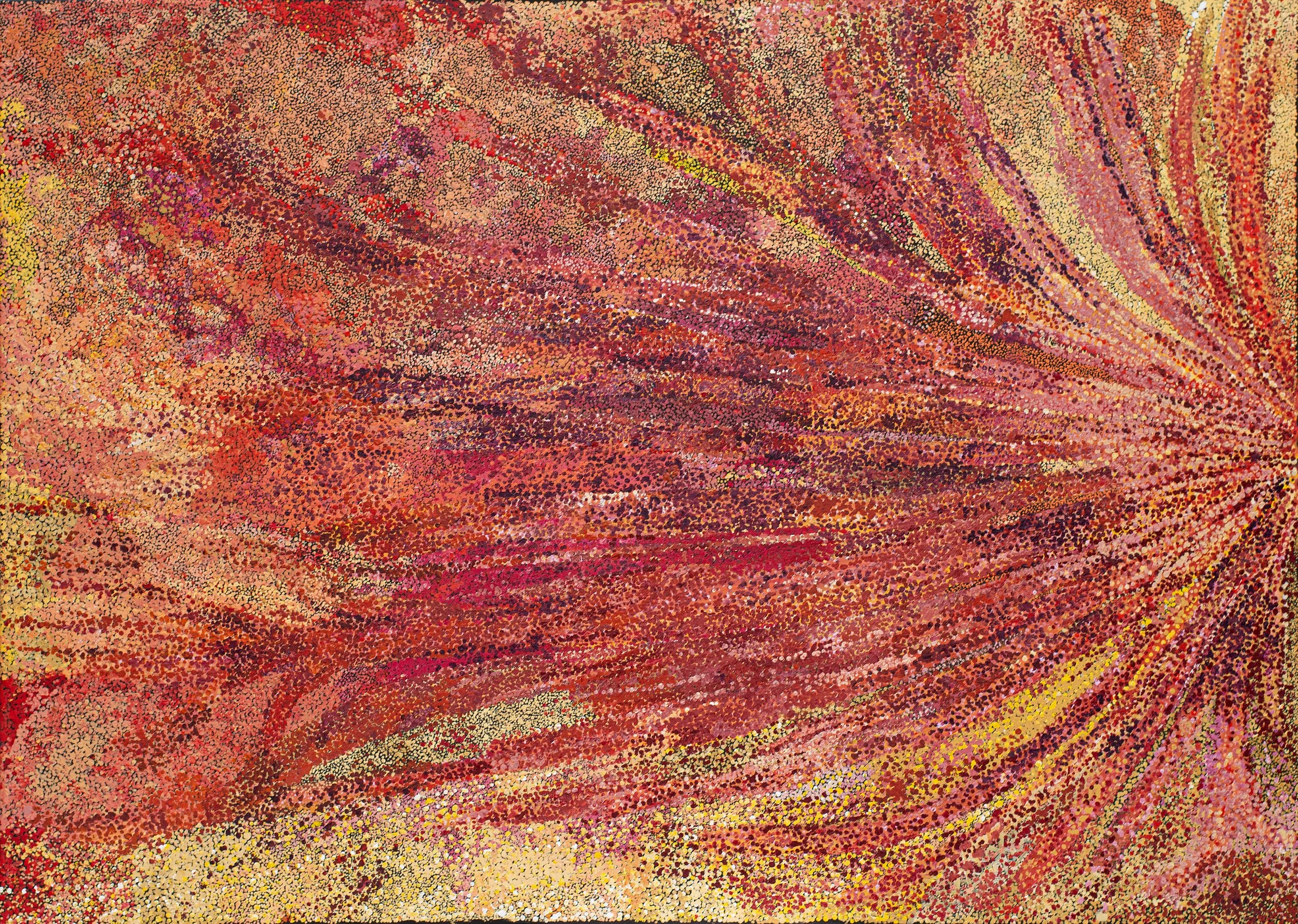 Toutes et tous partagent une même grammaire de ce geste graphique — points, lignes, cercles et silences — qui active le Country plutôt qu’elle ne l’illustre, mais chacun en porte une signification singulière : Rachael Mipantjiti Lionel, troisième génération de femmes Lionel à Ernabella, peint les messages reçus en rêve ; ici la tempête de poussière qui roule vers elle dans le désert, vision d’alerte et d’endurance. Atipalku Intjalki (1955) traite du Tjukurpa Mulayangu, lieu de Loi des hommes lié au pays de son père, à l’ouest d’Amata, avec le site sacré Tankalanya — ce qu’il peut en dire s’arrête là, par respect du secret.