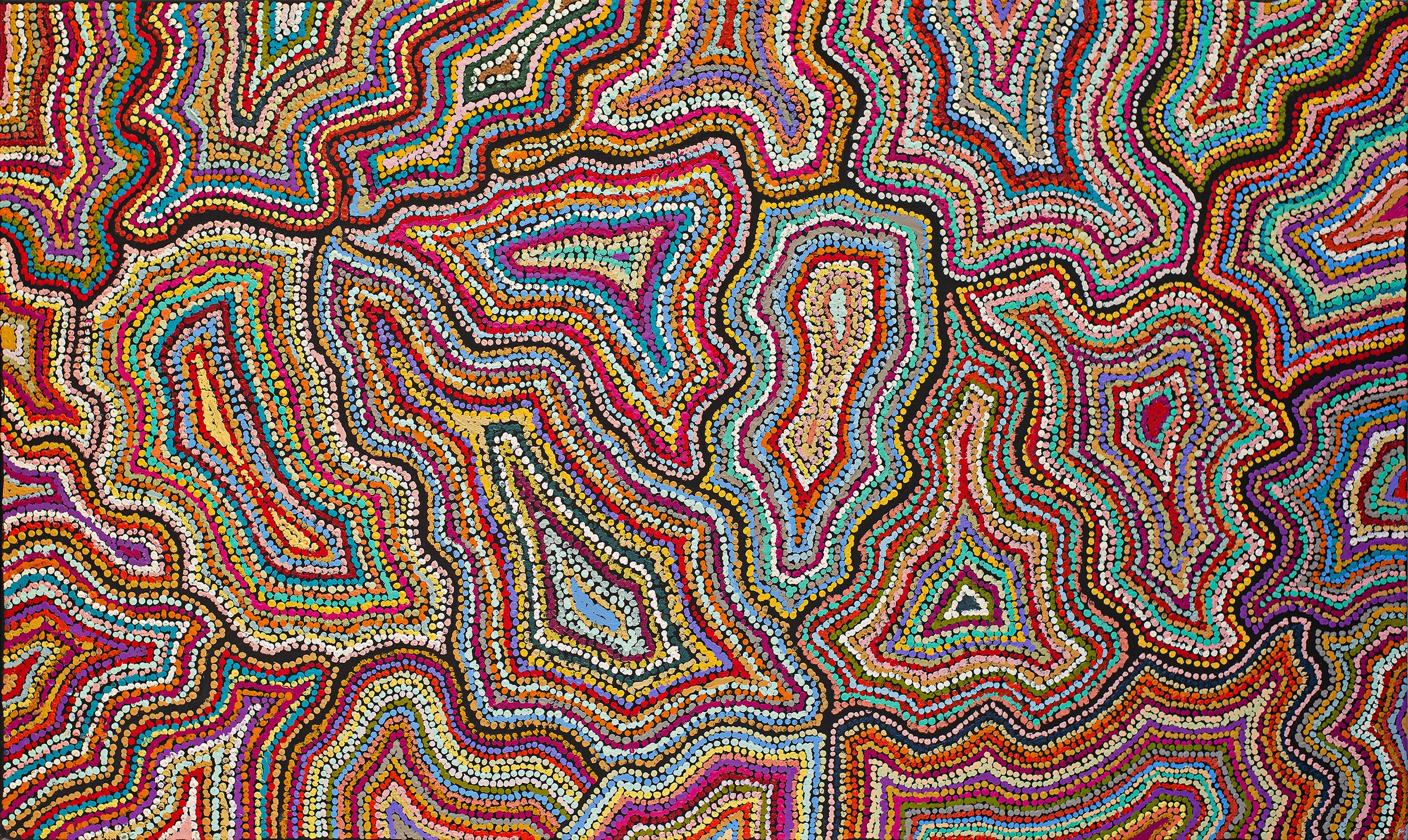 La structure des œuvres repose sur un ensemble de lignes concentriques, de réseaux ondulés et de couloirs de couleur, caractéristiques du langage visuel Aṉangu. Les cercles désignent les rockholes, campements ou points de cérémonie, tandis que les lignes ondulées évoquent les itinéraires ancestraux, les lits de ruisseaux ou les axes d’énergie du paysage. Le territoire est ainsi présenté comme une succession d’unités reliées entre elles, formant une géographie narrative où les formes et les couleurs guident l’œil à travers une lecture — ou plutôt une relecture — du désert.