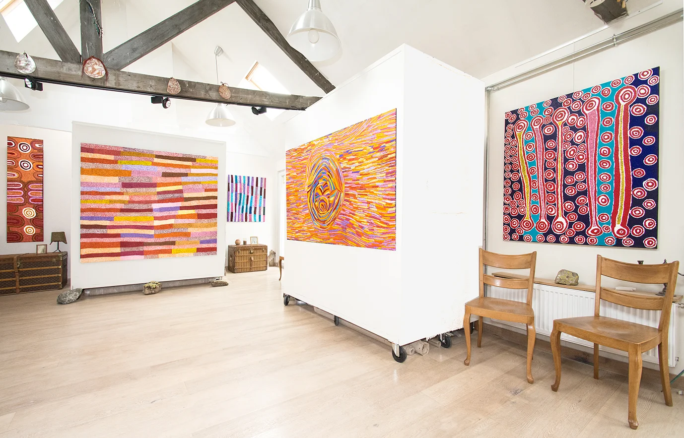 Vue de l'exposition d'art Aborigène "From the past to the present with Ninuku art". Au fond de la pièce, trois œuvres de l'artiste Tjulkiwa Atira Atira. A droite une œuvre de l'artiste Jennifer Connelly, puis au premier plan une peinture de l'artiste Jennifer Forbes. Photo : Aboriginal Signature • Estrangin gallery with the courtesy of the artists and Ninuku Arts.
