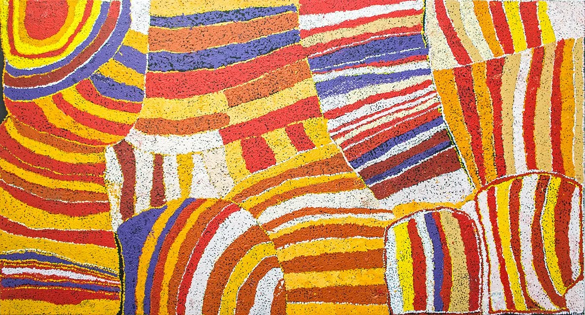 Œuvre de l'artiste Kunmanara (Nyankulya Walayampari) Watson (1938-2012). Format : 200 x 100 cm. © Photo : Aboriginal Signature gallery, with the courtesy of the artist and Ninuku Arts.