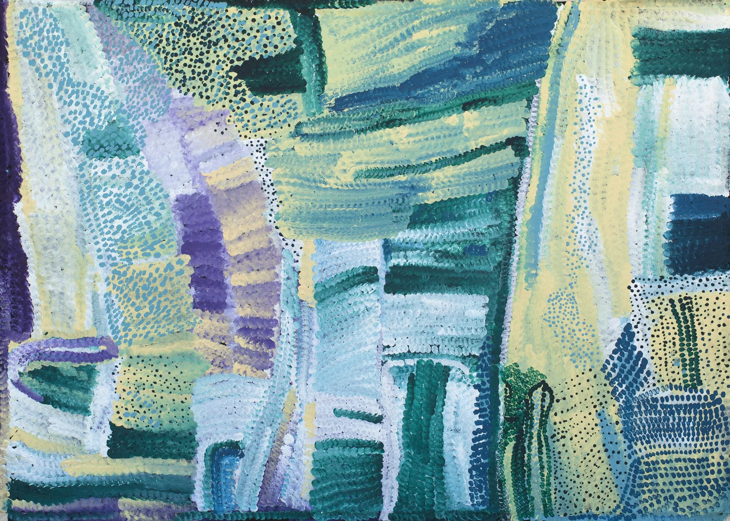Œuvre de l'artiste Aborigène Bugai Whyoulter. Titre : Wantili Claypan (Well 24). Format : 152 x 108 cm. © Photo Aboriginal Signature Estrangin with the courtesy of Martumili Artists