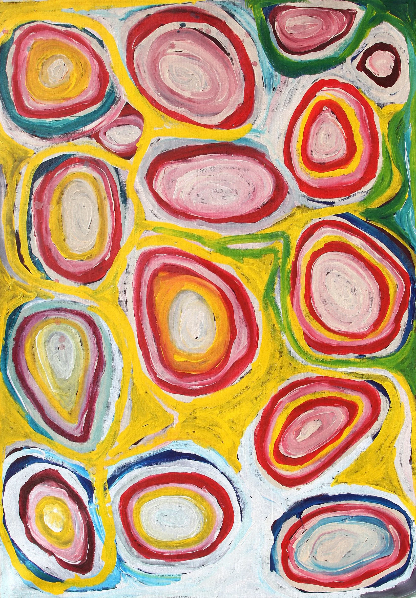 Leurs peintures y compris aujourd’hui, resplendissent des cheminements nomades à travers les tracés codifiés des ancêtres et évoquent ici ou là les lieux emblématiques du Temps du Rêve.