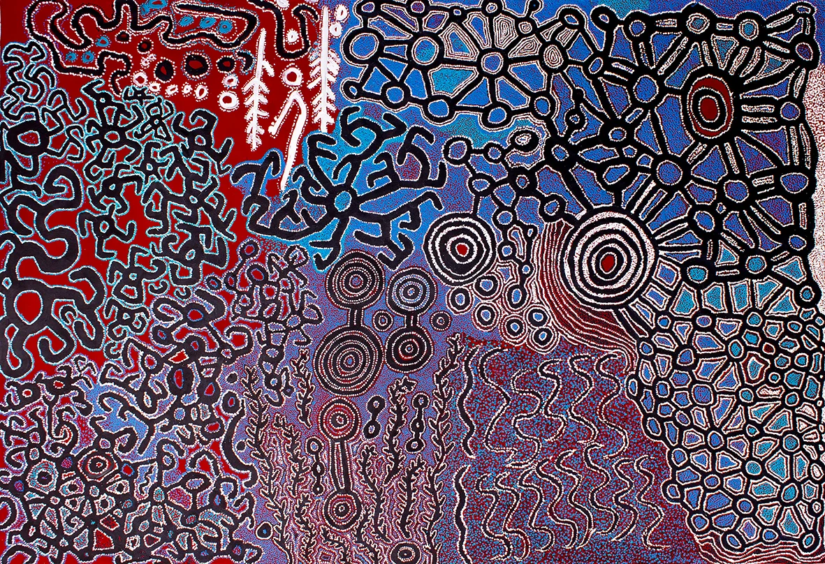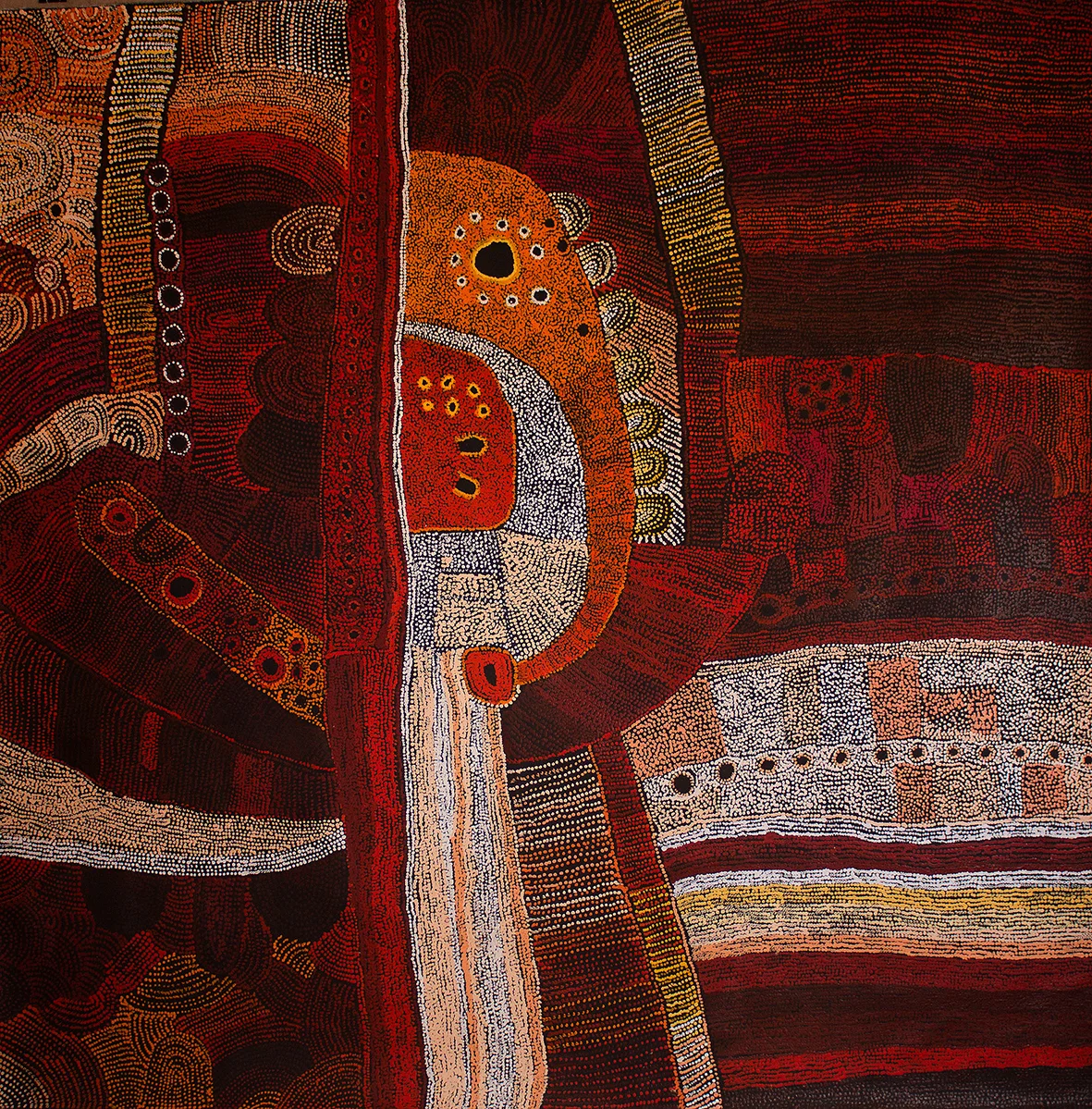 Peinture acrylique sur toile de l'artiste Pepai Jangala Carroll. Format : 180 x 170 cm. Provenance : centre d'art d'Ernabella. Photo : Aboriginal Signature gallery with the courtesy of the artist.