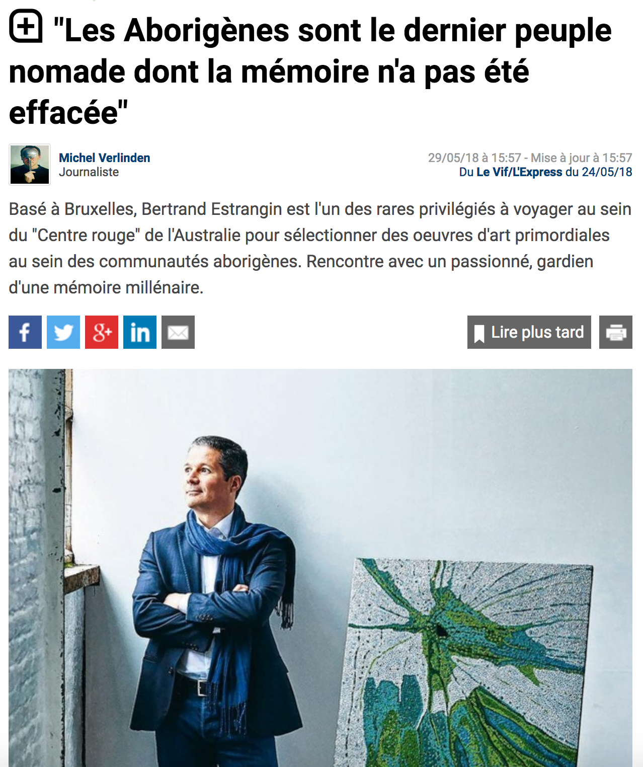 Un grand merci au magazine LE VIF - L'EXPRESS pour ce bel article sur la galerie toute dédiée aux artistes Aborigènes des différentes régions de l'Australie, ici à Bruxelles. Le texte du journaliste Michel Verlinden met en perspective très justement ce mouvement artistique, dont les œuvres rayonnent dans la capitale de l'Europe. A découvrir ici.