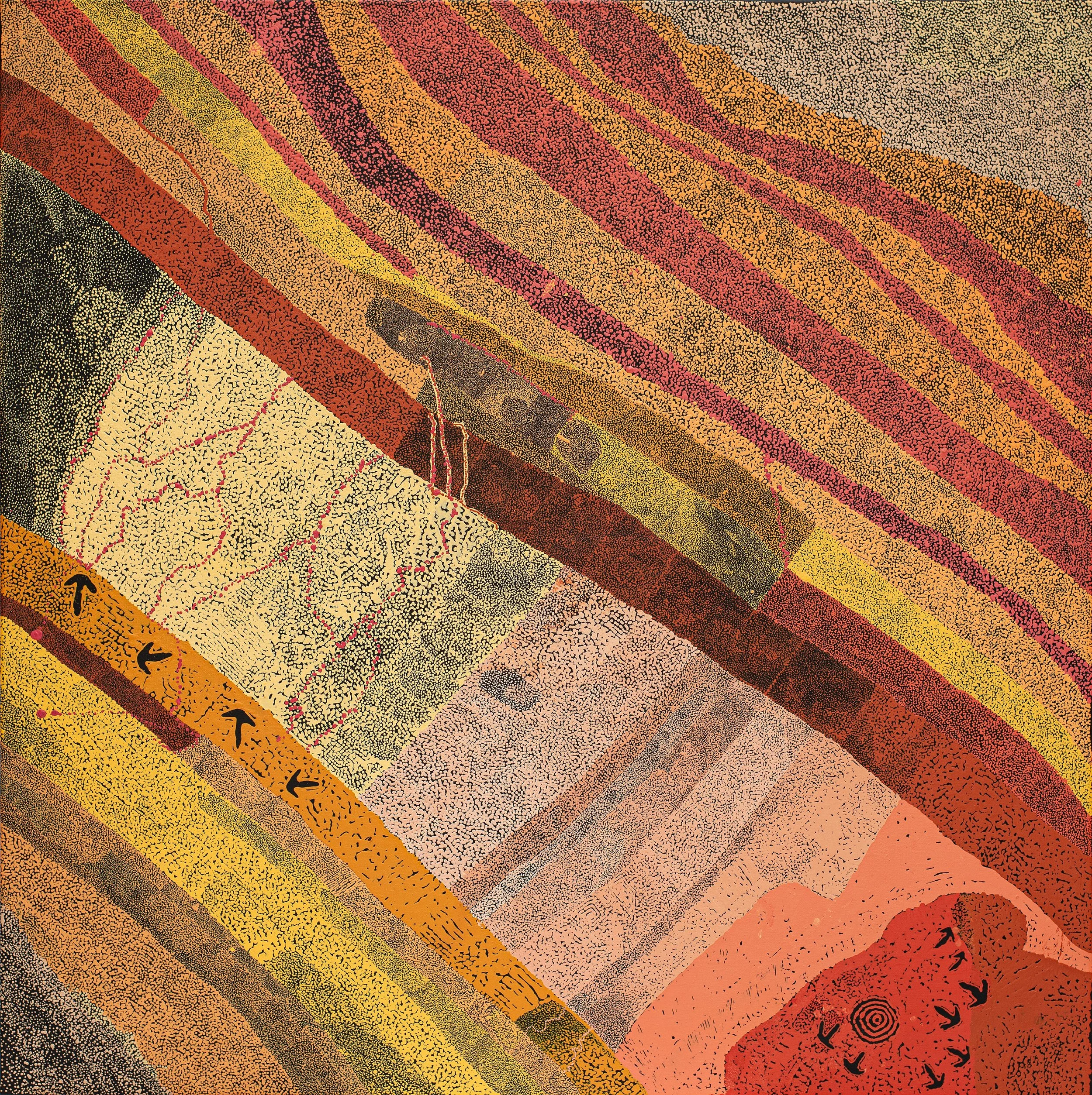 Au cœur de cette exposition s’élève le Yankirri Jukurrpa, le Rêve de l’Émeu, enraciné dans le site sacré de Ngarlikirlangu, à une cinquantaine de kilomètres au nord de Yuendumu.