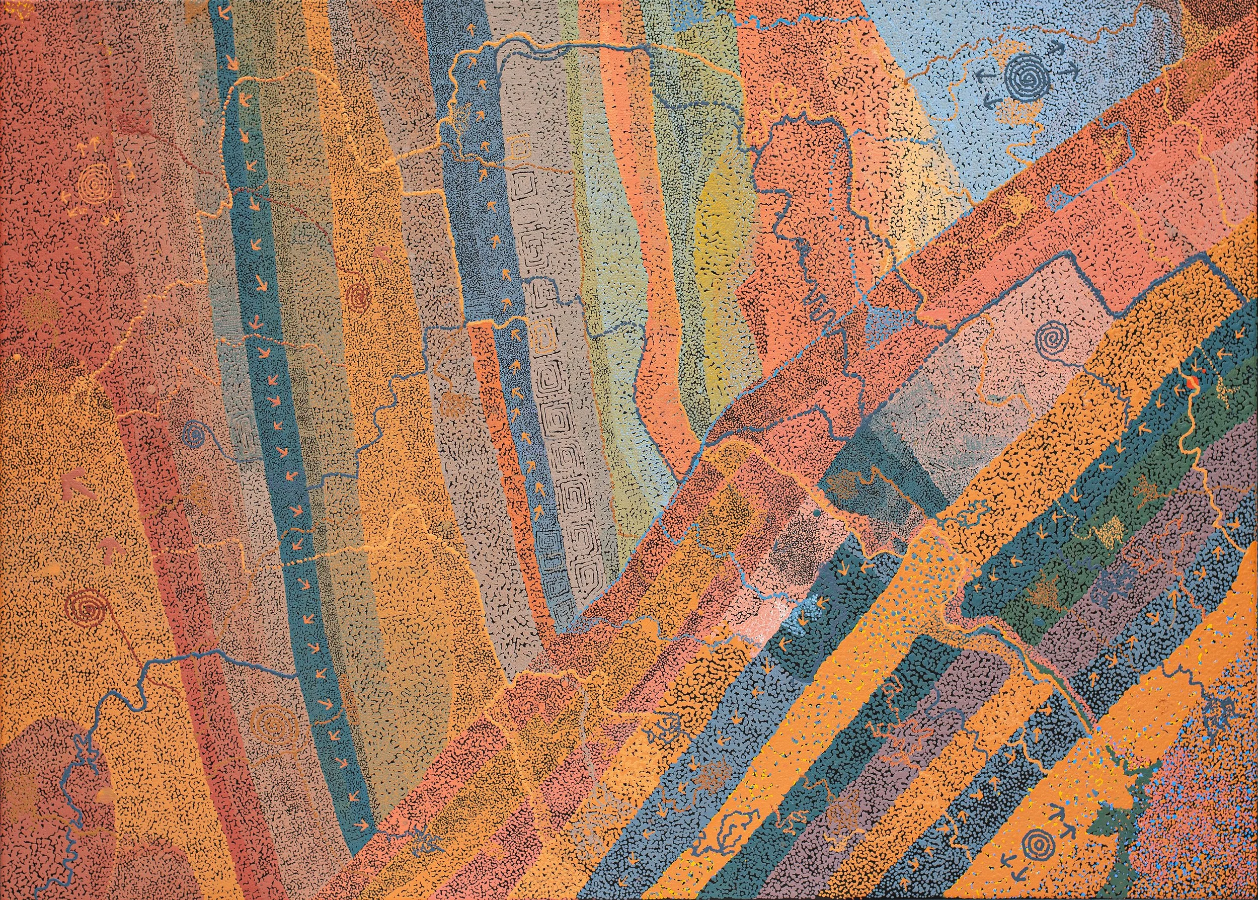 Dans ses peintures, Lloyd Jampijinpa Brown fait affleurer la vibration intime de ces récits ancestraux.