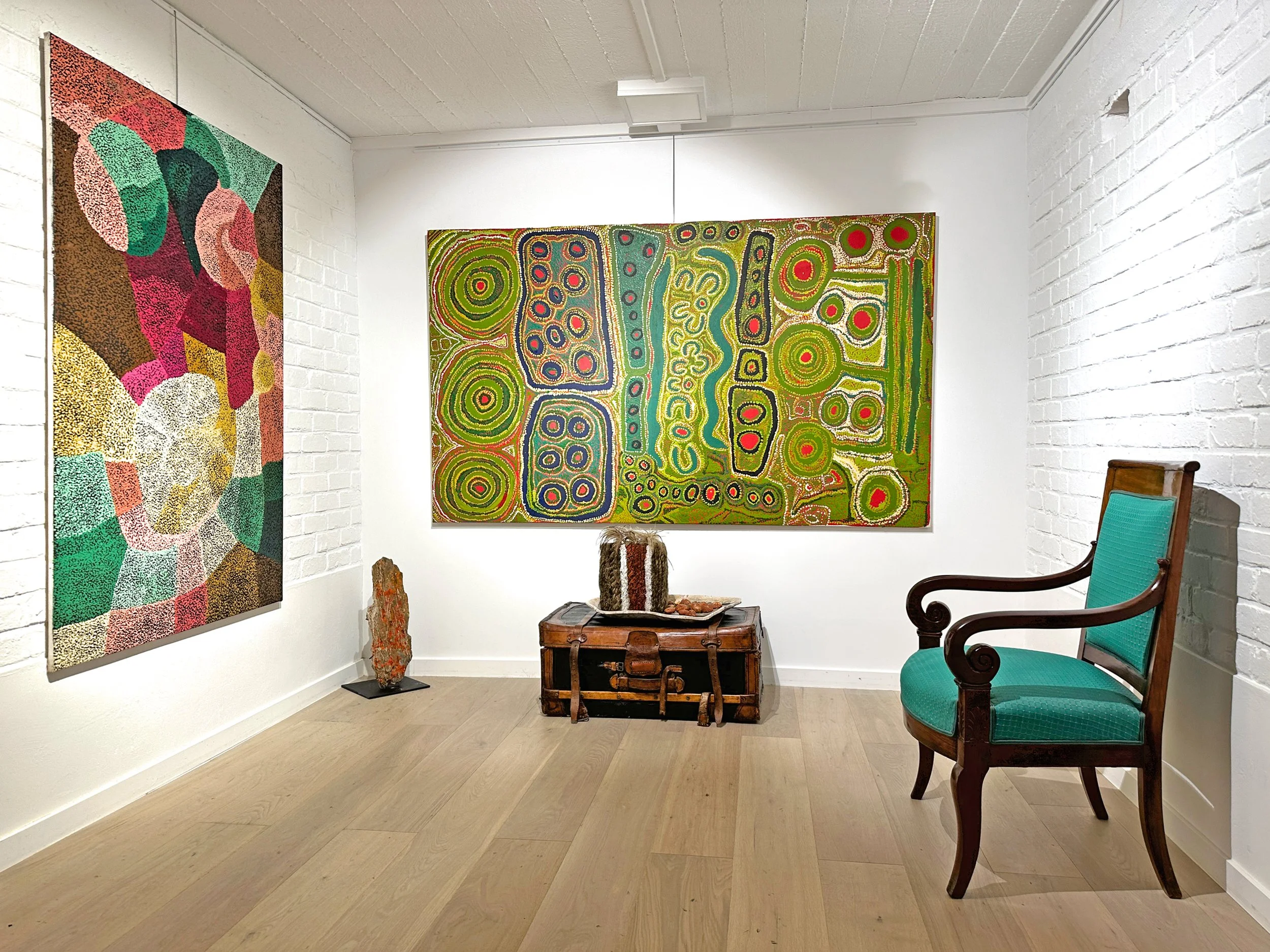 Vue de l’exposition d’art Aborigène “The Past is always Present” © Photo : Aboriginal Signature Estrangin Gallery with the courtesy of the artist and Tjungu Palya.